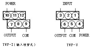 注: 1、YWF、YWL系列交流電流變送器輸入線從變送器外殼設置的穿孔穿過,不分J性。