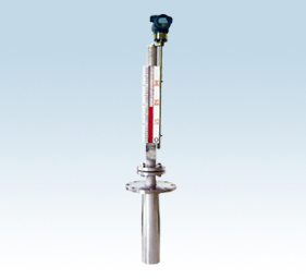 該產(chǎn)品由本體(由上、下導管組成)、翻板箱(由紅、白雙色磁性小翻板組成)、浮子(由磁體、D桿、浮筒 組成)、以及液位變送器等組成,其結(jié)構(gòu)如圖所示。工作原理為:容器內(nèi)的浮筒(按不同介質(zhì)和壓力針對研制), 在下導管中隨液面高度的變化而上下浮動并通過D桿使磁體在上導管內(nèi)上下移動,促使本體外的翻板翻動 并顯示紅、白顏色來指示液面高度,同時液位變送器將液位信號傳送至控制中芯進行液位指示和控制,也 可通過計算機進行集中監(jiān)控。